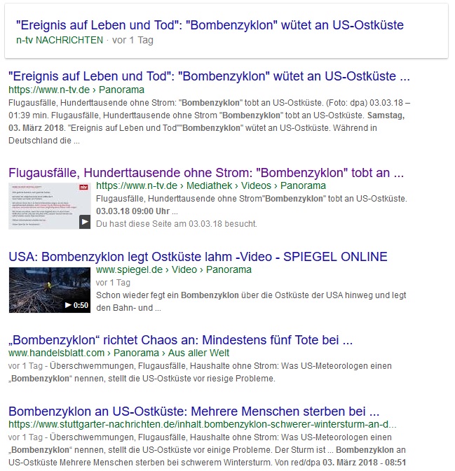 Ja, Journalisten haben es schwer. Immer was Neues erfinden müssen. Und da gibt es dann den "Bomben-Zyklon". Schnell aus dem Englischen übersetzt, wie auch jedes Gewitter in den USA (oder auf der "Insel") neuerdings zum STURM wird, hastig und unüberlegt aus "thunderstorm" übersetzt (thunderstorm = Gewitter!). Heute nun also der "Bomben-Zyklon" bei Focus, T-online u.a. Nur der SPIEGEL besann sich rechtzeitig auf eine richtige Übersetzung.